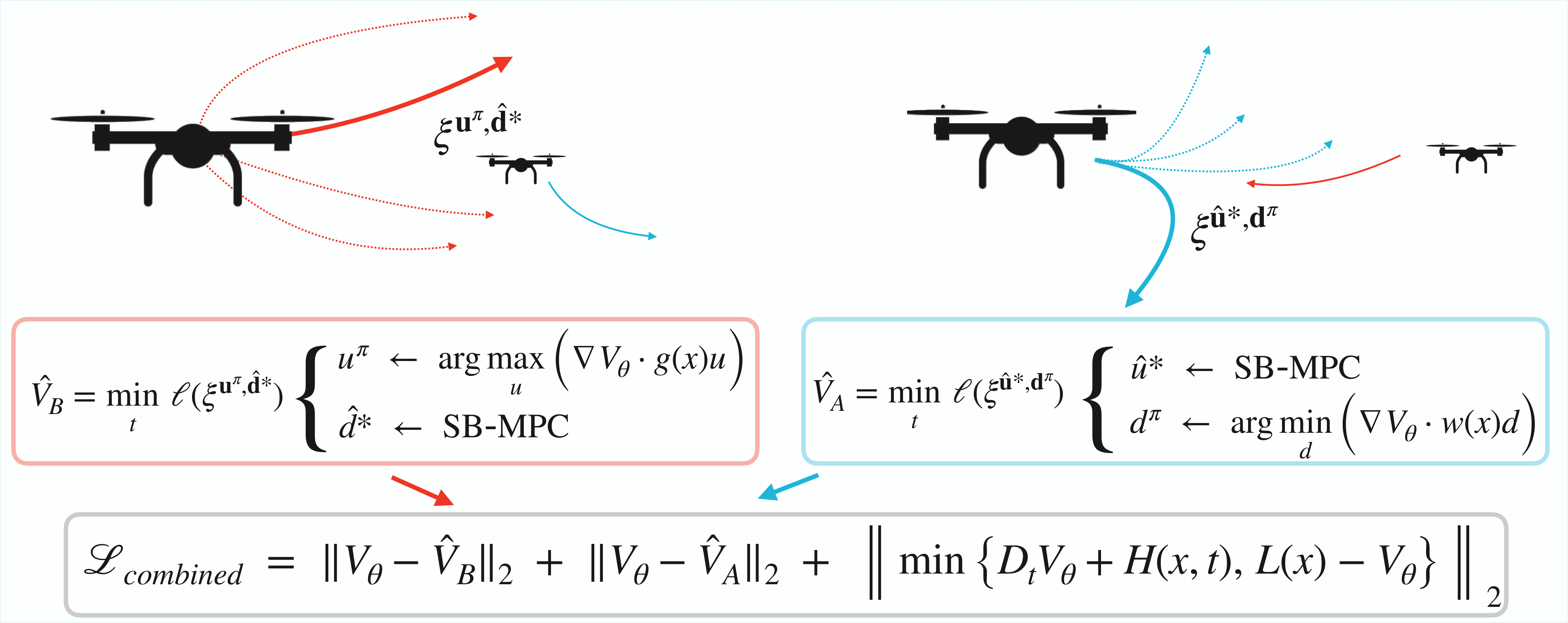 A graphical abstract of MADR and the robotic experiments. In this work, we propose enriching self-supervised learning of HJ-PDE's, i.e. DeepReach, with supervision given by the best sampled game rollout (top left),